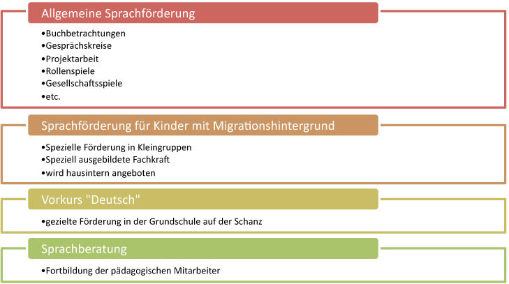 Die folgende Übersicht verdeutlicht wie das Kinderhaus Marienheim Sprachkompetenzen vermittelt, unterstützt und begleitet: